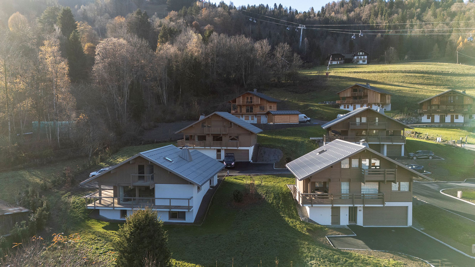 Die Grundflächen reichen von 152 m² bis 242 m², und alle Häuser verfügen über einen Wellnessbereich, einen privaten Garten, eine Garage, einen Skiraum und eine schöne Innenausstattung. Frühere Arbeiten des Bauträgers sind auf den Fotos zu sehen.