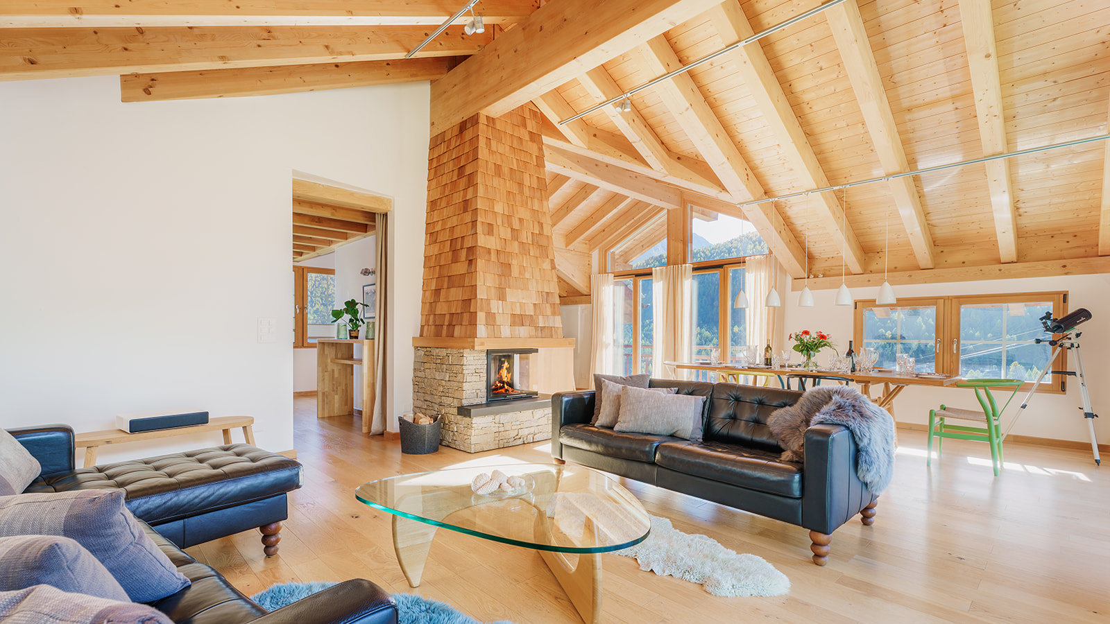 Auf den beiden obersten Etagen des Chalet Jessica befindet sich diese beeindruckende Penthouse-Residenz mitten im Zentrum von Saas Fee.
