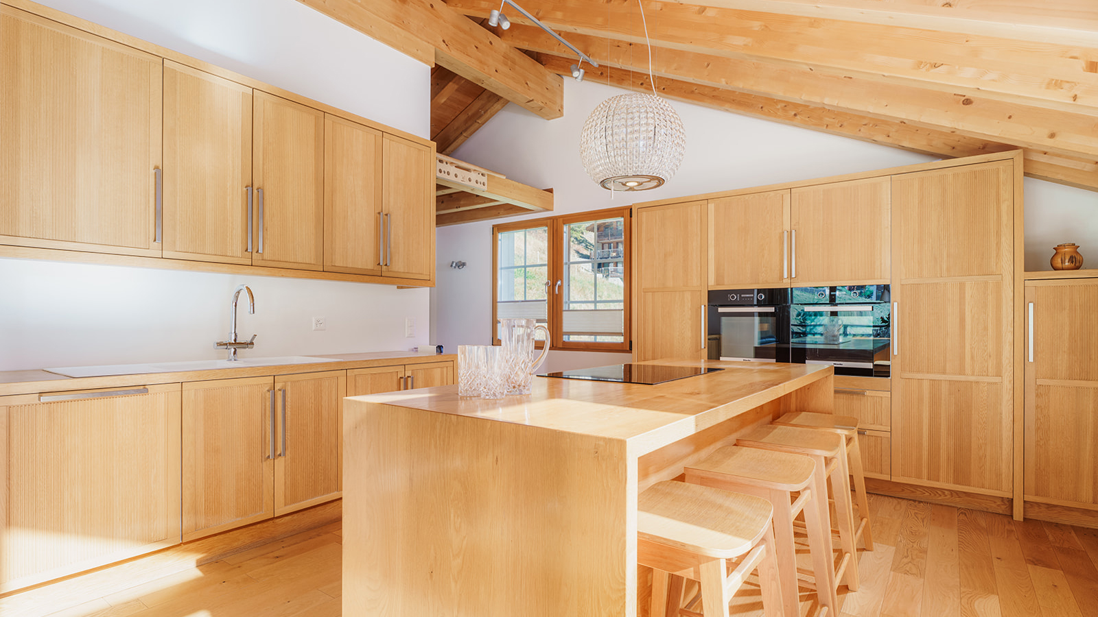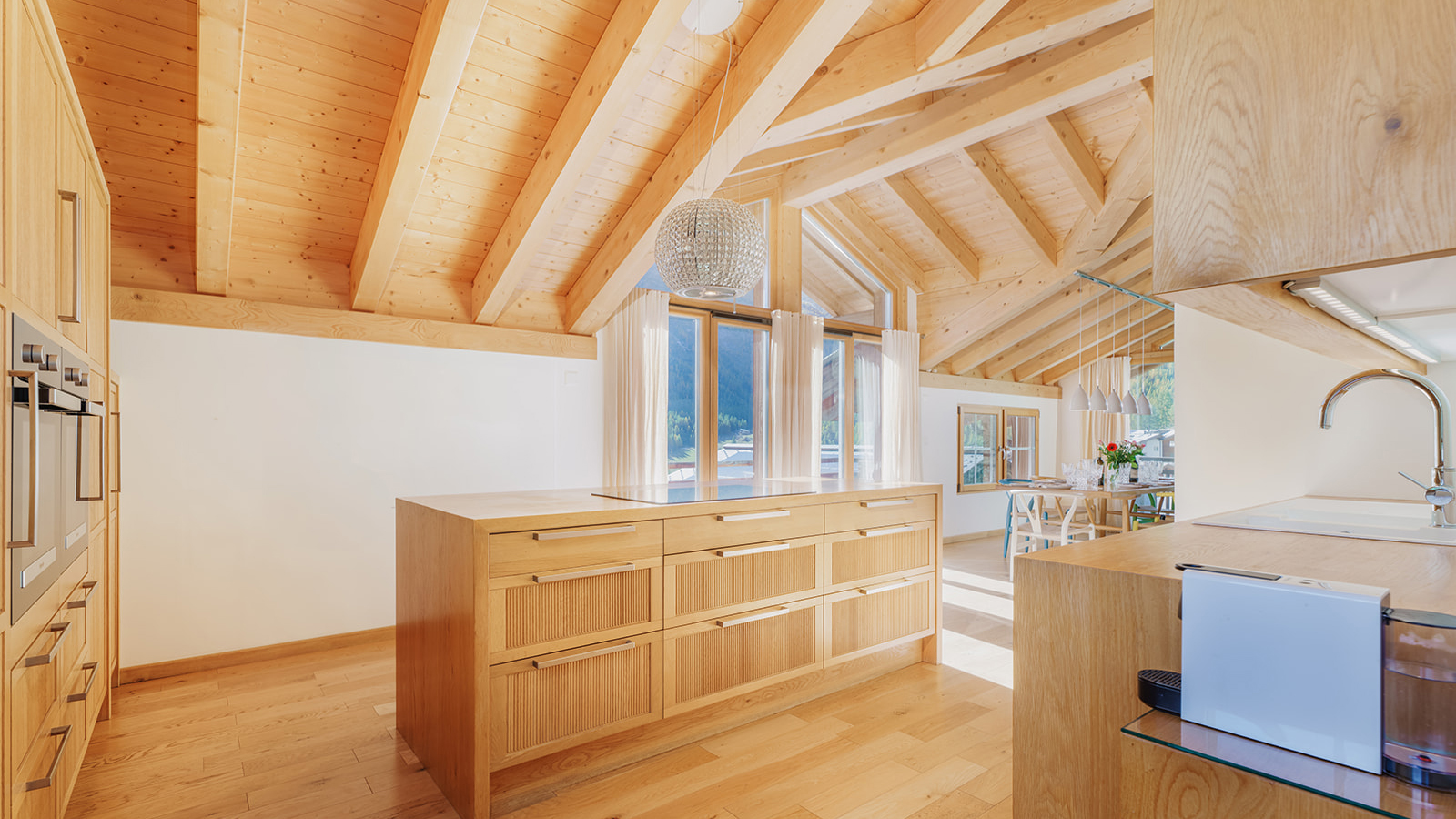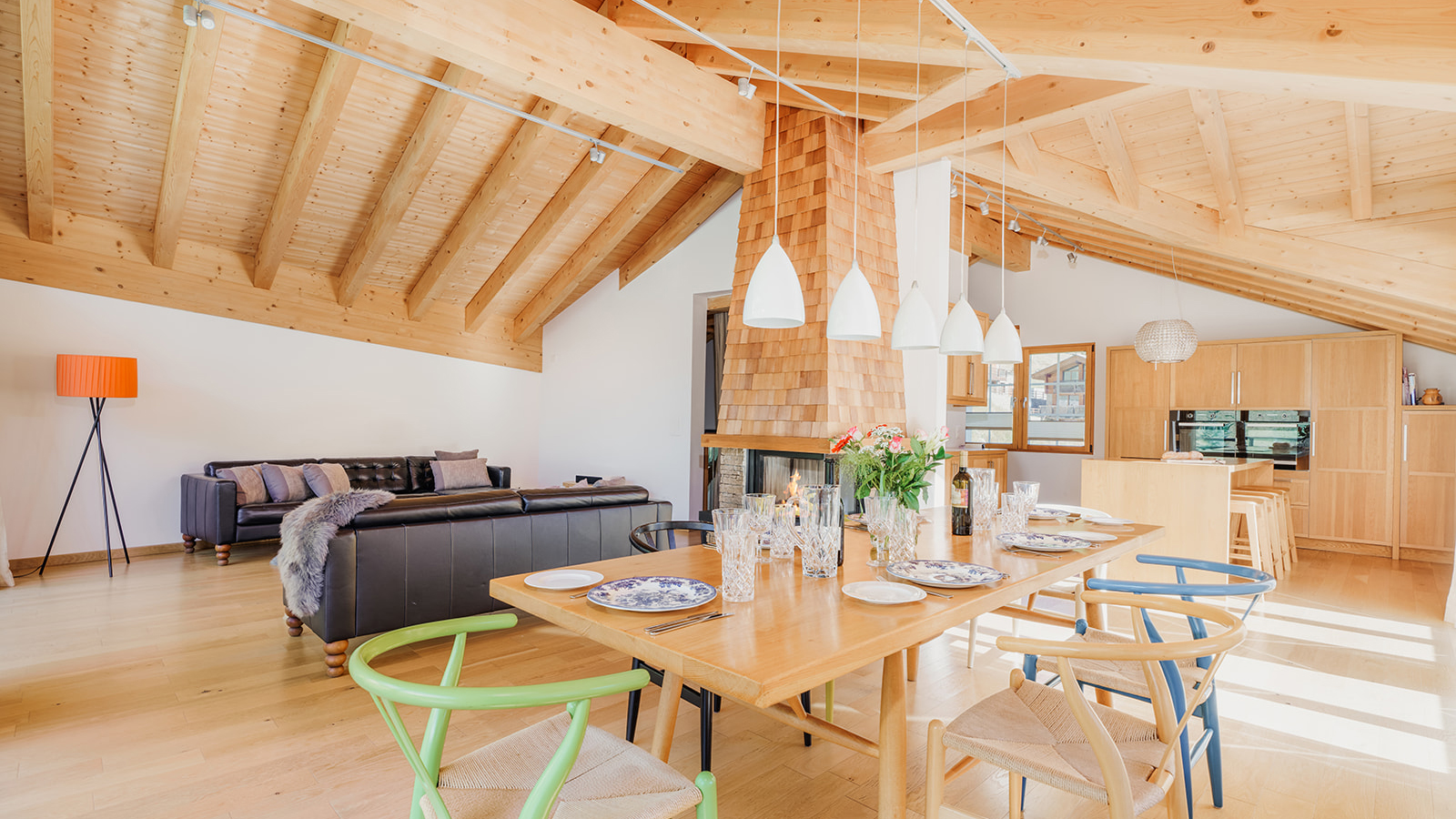 Built only in 2012 to a high standard, the chalet is set over three floors and offers a bright interior with five bedrooms and four bathrooms. The main focus of Lapin is no doubt its top floor, double height living space which consists of a sitting/dining room with a central fireplace and a fully equipped kitchen with an island.